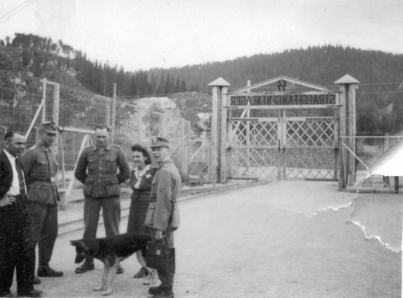 Начальница женского блока норвежского концлагеря Фальстад (Falstad) Мария Роббе (Maria Robbe) с полицейскими у ворот лагеря.