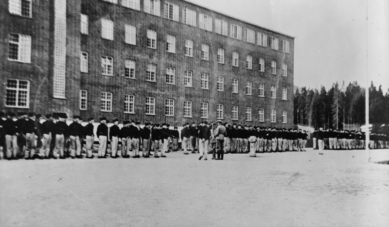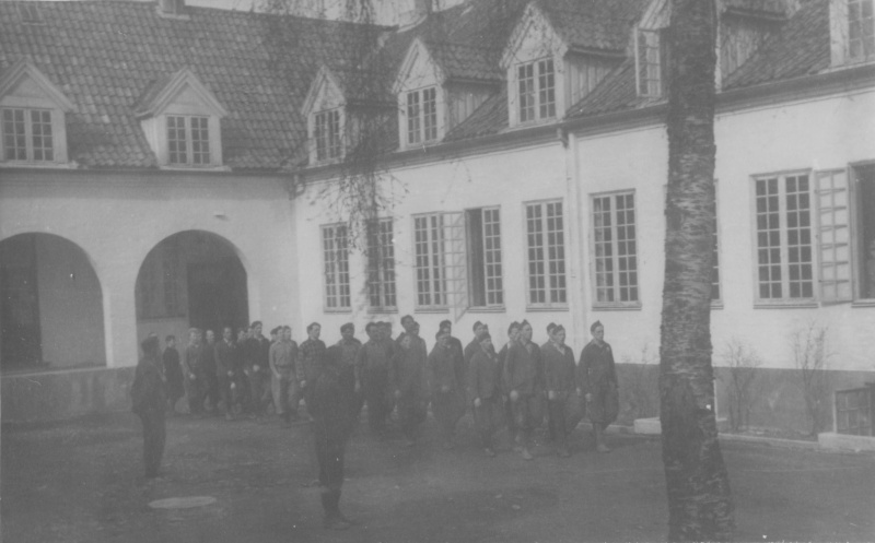 Колонна заключенных норвежского концлагеря Фальстад (Falstad) проходит во внутреннем дворе главного здания.