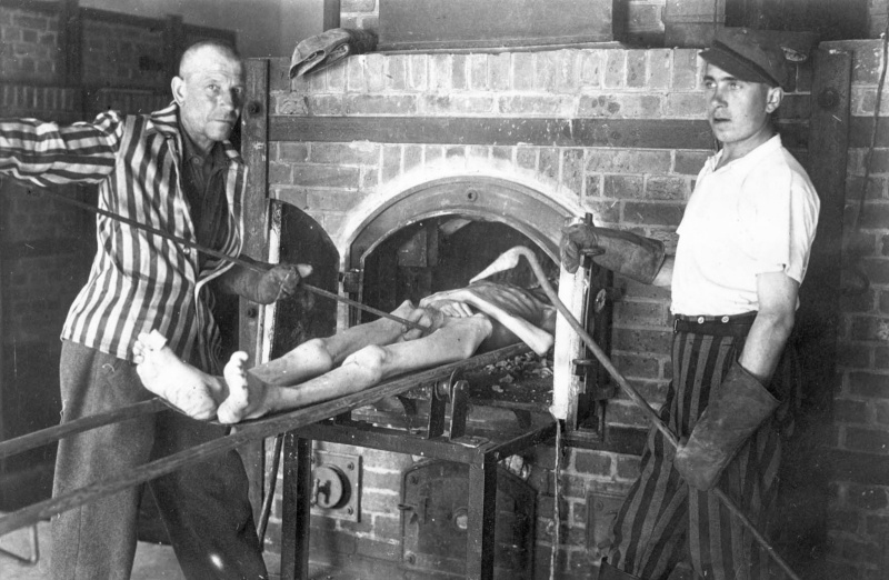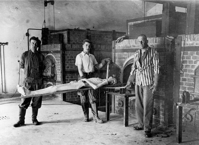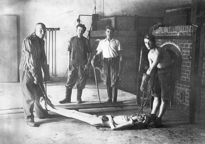 Заключенные демонстрируют процесс уничтожения трупов в крематории концлагеря Дахау.