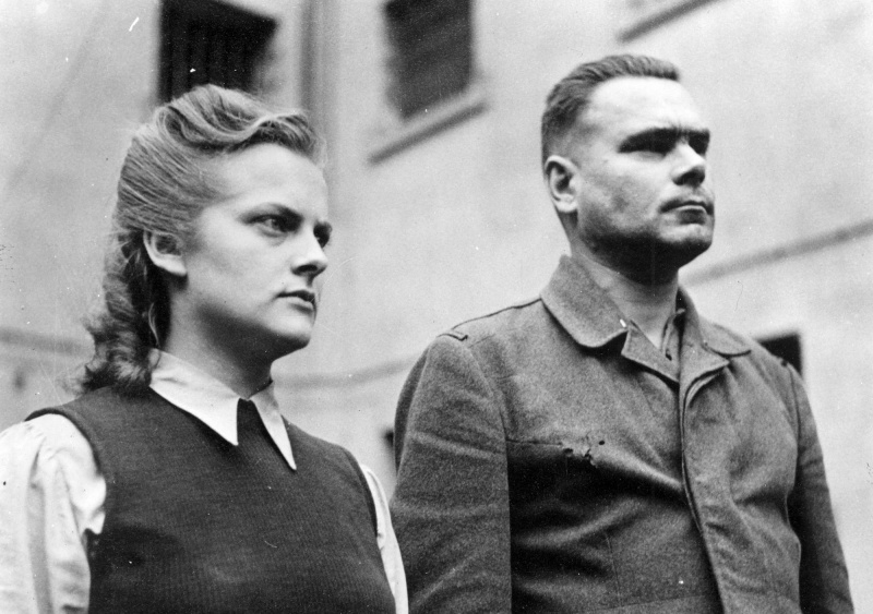 Ирма Грезе и Йозеф Крамер во дворе тюрьмы немецкого города Целле. Руководитель службы труда женского блока концлагеря Берген-Бельзен - Ирма Грезе (Irma Grese) и его комендант гауптштурмфюрер (капитан) СС Йозеф Крамер (Josef Kramer) под британским конвоем во дворе тюрьмы города Целле, Германия.