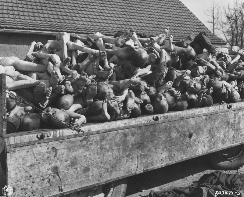 В кузове прицепа - трупы узников концентрационного лагеря Бухенвальд, приготовленные для сжигания в крематории.