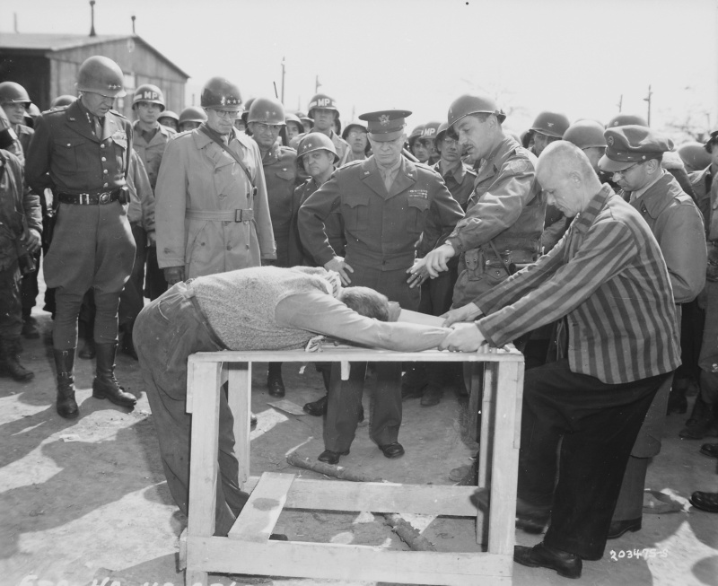 Американские генералы (справа налево) Дуайт Эйзенхауэр, Омар Брэдли и Джордж Паттон наблюдают за демонстрацией одного из методов пыток в концентрационном лагере Гота (Gotha).