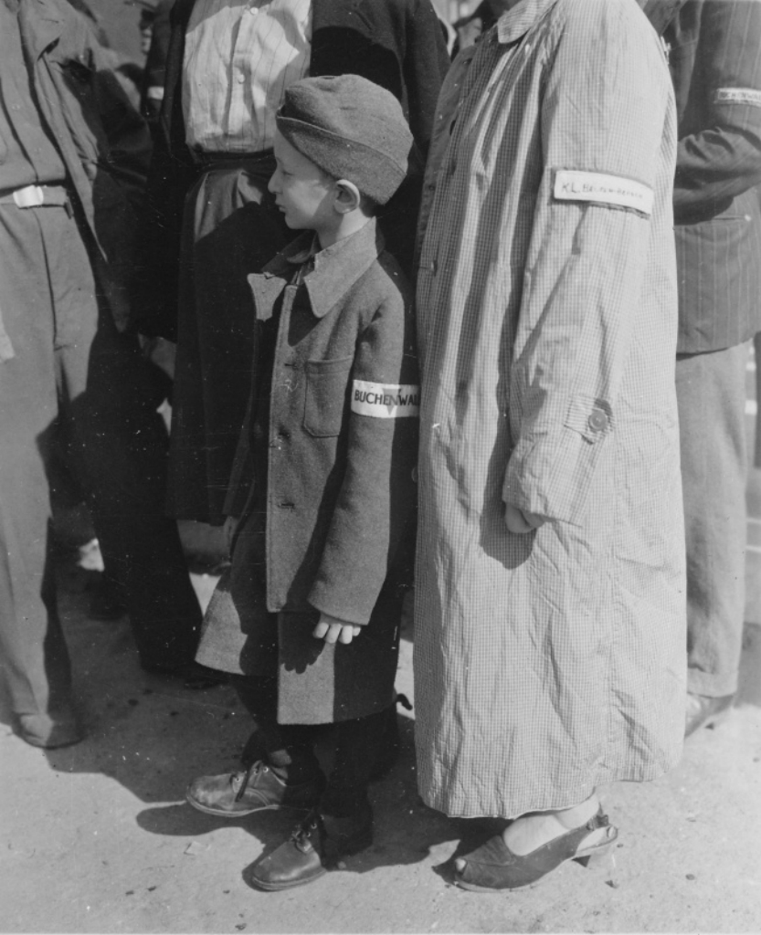 Освобожденный семилетний узник концлагеря Бухенвальд в очереди перед отправкой в Швейцарию.