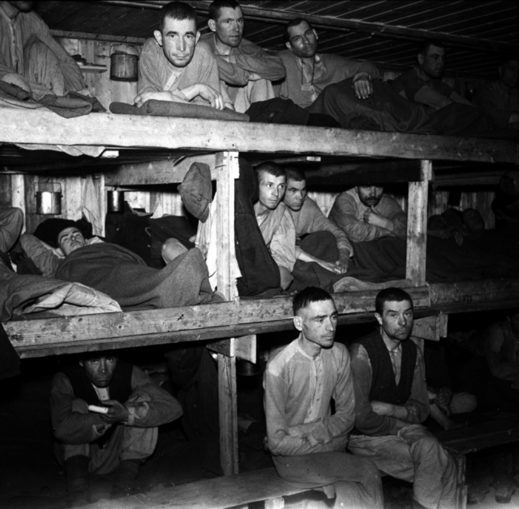 Советские военнопленные в бараке после освобождения из концлагеря Салтфьеллет в Норвегии.