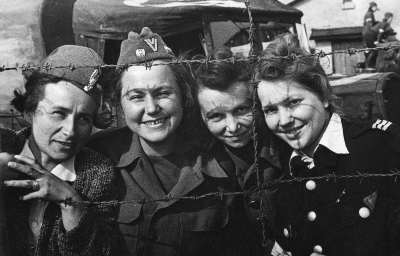 Женщины, освобожденные Красной Армией из концентрационного лагеря Равенсбрюк, находившегося в 90 километров к северу от Берлина. Равенсбрюк - концентрационный лагерь Третьего рейха, располагавшийся на северо-востоке Германии в 90 километрах к северу от Берлина. Существовал с мая 1939 до конца апреля 1945 года. Крупнейший женский концентрационный лагерь нацистов. Количество зарегистрированных заключенных за все время его существования составило более 130 тысяч человек. По официальным данным, здесь погибли 90 тысяч узников.