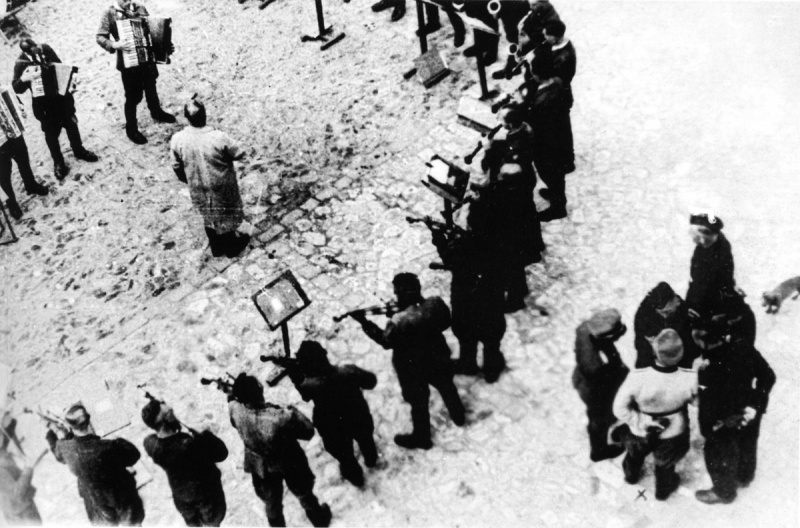 Оркестр заключенных Яновского концлагеря исполняет "Танго смерти". Накануне освобождения Львова частями Красной Армии немцы выстроили круг из 40 человек из оркестра. Охрана лагеря окружила музыкантов плотным кольцом и приказала играть. Сначала был казнен дирижер оркестра Мунд, дальше по приказу коменданта каждый оркестрант выходил в центр круга, клал свой инструмент на землю и раздевался догола, после чего его убивали выстрелом в голову.