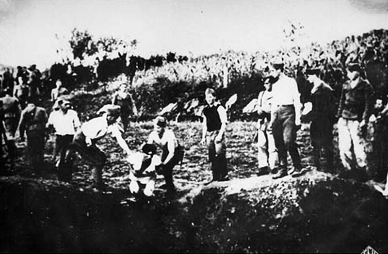 Усташи казнят заключенных в концлагере Ясеновац. Ясеновац - система лагерей смерти, созданная усташами (хорватскими нацистами) в августе 1941 года. Располагалась на территории Независимого хорватского государства, сотрудничавшего с нацистской Германией, в 60 километрах от Загреба. Единого мнения о количестве жертв Ясеноваца нет. В то время, как официальные югославские власти во время существования этого государства поддерживали версию о 840 тысячах жертв, по подсчетам хорватского историка Владимира Жерявича, их число составило 83 тысячи, сербского историка Боголюба Кочовича - 70 тысяч. Мемориальный музей в Ясеноваце содержит сведения о 75 159 жертвах, a Мемориальный музей Холокоста говорит от 56-97 тысячах жертв.