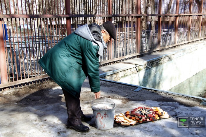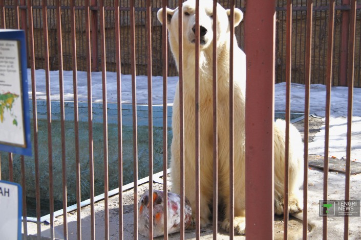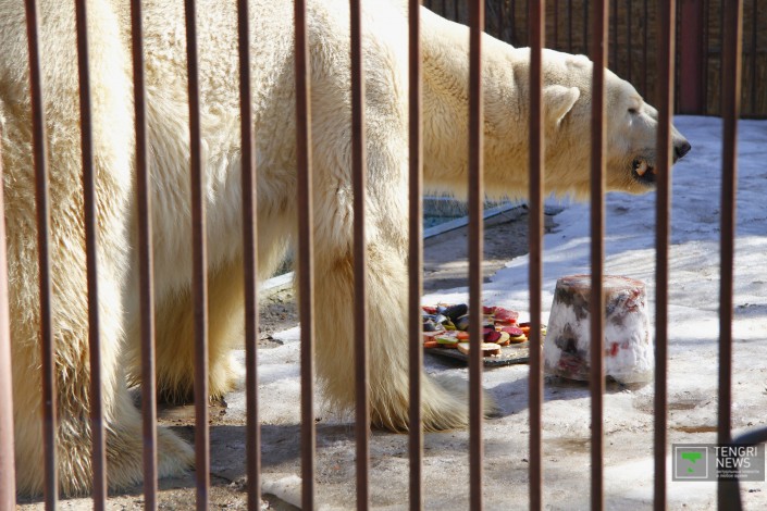 В зоопарке Алматы отмечают Международный день полярного медведя. По этому случаю для белого медведя приготовили торт из рыбы, мяса и овощей, а также своеобразное "мороженое", сообщает корреспондент Tengrinews.kz.