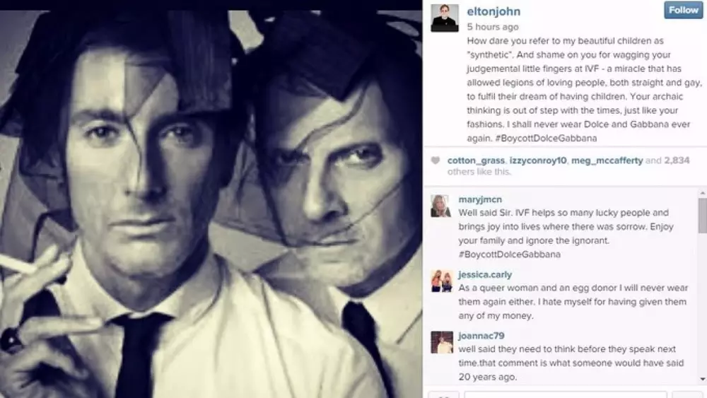 "Ваш архаический образ мысли также отстал от времени, как и ваша мода. Я больше никогда не буду носить Dolce & Gabbana", - заявил Элтон Джон на своей страничке в Instagram. К своей реплике Элтон Джон добавил хэштег #BoycottDolceGabbana.