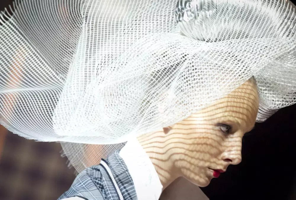 Дизайнера Кенже нашла необычный источник вдохновения: на создание коллекции ее подтолкнула гофра от вытяжки, поэтому на каждую модель был надет головной убор, напоминающий этот кухонный предмет. Кенже почти во всех изделиях из новой коллекции использовала всего один шов.