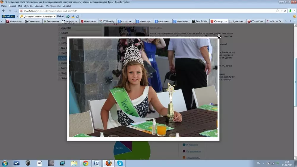Тринадцатилетняя школьница из Тулы Анастасия Сивова завоевала главный приз конкурса красоты "Маленькая Мисс планеты-2013" в своей возрастной категории, сообщает "Интерфакс-Казахстан" со ссылкой на пресс-службу горадминистрации. Конкурс, в котором принимали участие девочки из 70 стран, проходил в городе Бургас в Болгарии. Члены жюри оценивали не только внешние данные участниц, юные красавицы соревновались в конкурсах на лучшее исполнение песни и танца, дефиле в красочных костюмах, а также владение английским языком. Сивова завоевала титул "Мисс планеты" в категории "Подросток". Сивова - участница тульского народно-хореографического ансамбля "Счастье детям". Это уже не первая награда, она удостоена званий "Маленькая красавица России-2011", "Вторая принцесса Мира- 2011" (Турция), обладательница специального приза международного конкурса "Звездочка Барселоны", лауреат конкурса "Королева Магриба" (Тунис), призер конкурсов "Хрустальная пирамида" (Париж) и "Одаренные дети России-2012".