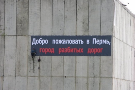 Автолюбители изготовили плакат с надписью "Добро пожаловать в Пермь, город разбитых дорог" и установили его на арендованном месте на въезде в город.