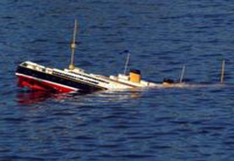 Носовая часть уже почти полностью ушла под воду. Экипаж состоящий из 12 человек находится на корме, которая дрейфует к берегу.