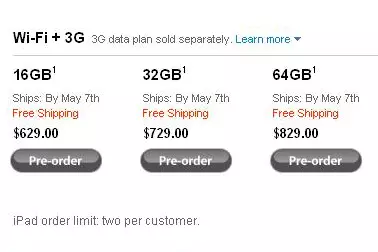 Стоимость модели iPad с 3G-модулем и встроенным GPS-навигатором варьируется от 629 до 829 долларов в зависимости от объема встроенной памяти (16, 32 и 64 гигабайта). Apple начала прием предварительных заказов на iPad в США 12 марта. При этом в одни руки отпускали лишь два планшета.