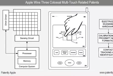 Бюро по регистрации патентов и торговых марок США выдало компании три патента. Наиболее важным среди выданных документов является патент под названием Portable electronic device with multi-touch input. В нем описывается способ увеличения изображенного на экране объекта путем сдвигания и раздвигания двух и более пальцев. Помимо этого, в документе отмечаются и другие действия над графическими объектами, включая вращение и перемещение.