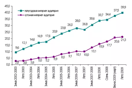 Летом 2009 года 35 процентов взрослого населения России, что составляет 39,9 миллиона человек, являлись пользователями интернета. Такая информация опубликована в бюллетене фонда "Общественное мнение" (ФОМ).