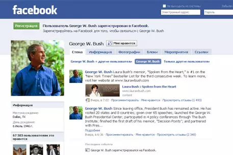 Бывший американский лидер Джордж Буш-младший завел аккаунт в социальной сети Facebook, пишет The Telegraph. На данный момент страницу экс-президента просмотрели около 60 тысяч человек.