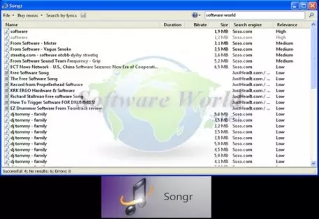 Ключевая особенность Songr заключается в возможности поиска не только по имени исполнителя или названию композиции (указывается в правом верхнем углу программы), но и по отдельным фразам из текста песни. Причем процесс загрузки контента отображается в отдельном окне, схожим на окно загрузки Internet Explorer, где процесс можно прервать в случае необходимости.