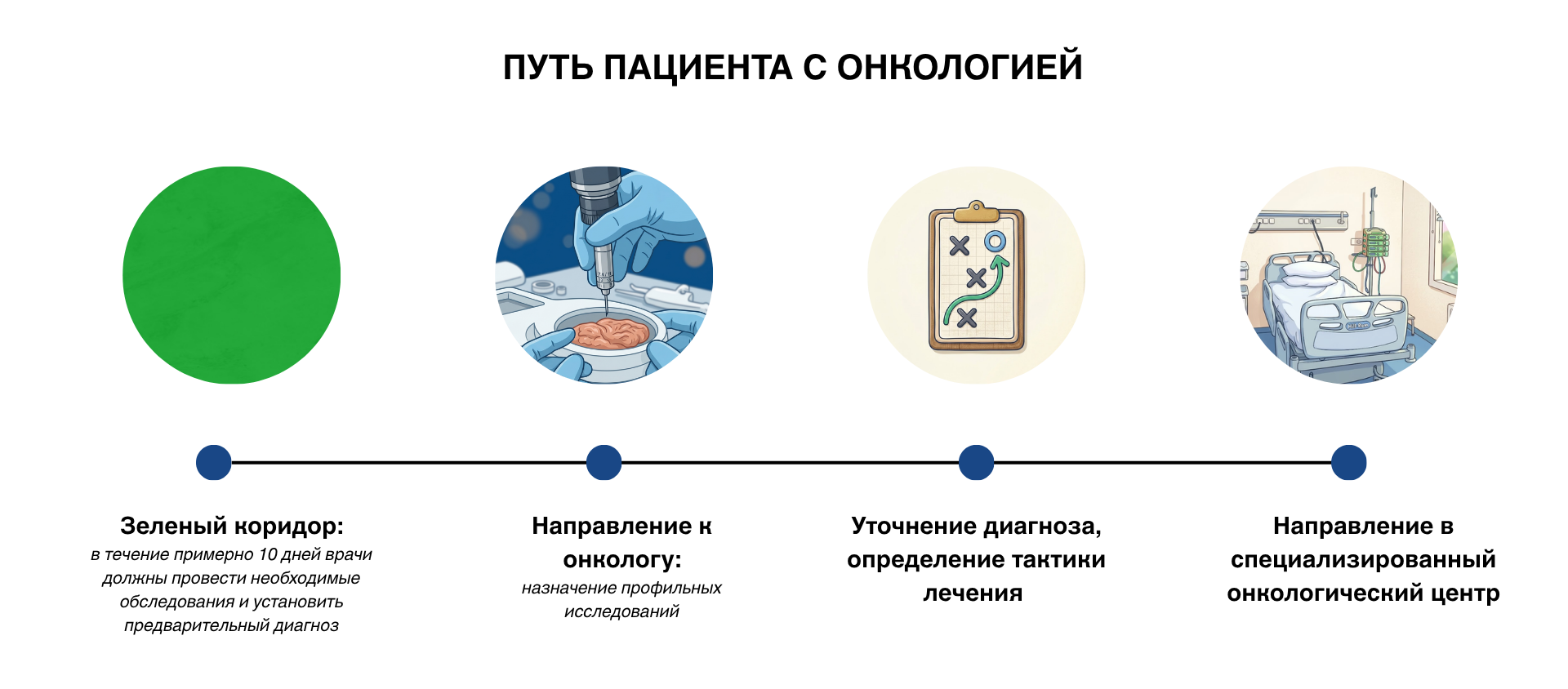 При подозрении на онкологию пациент попадает в так называемый зелёный коридор — систему, которая позволяет ускорить диагностику и не терять время. В течение примерно 10 дней врачи должны провести необходимые обследования и установить предварительный диагноз.
