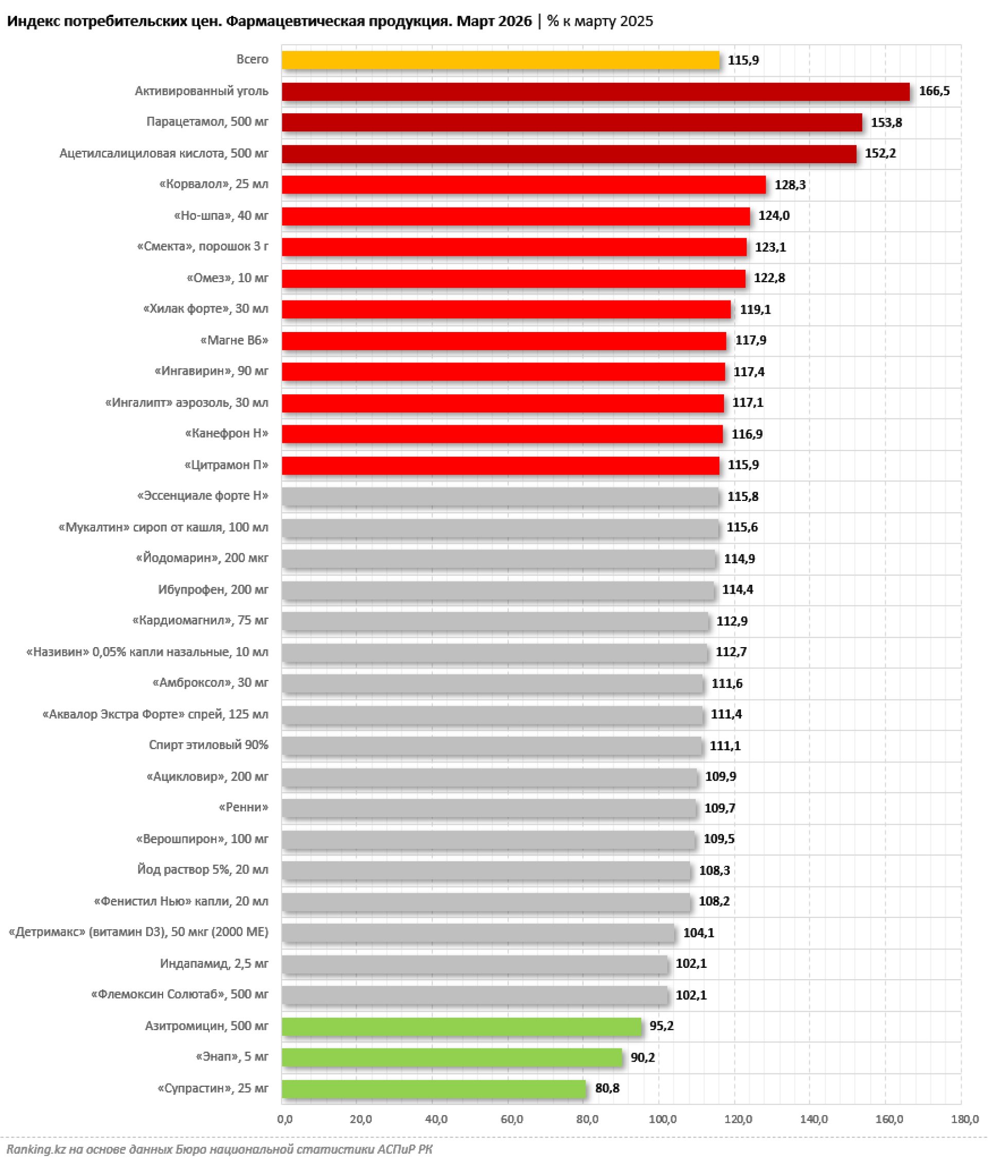 Как отмечают специалисты, которые провели анализ на основе данных Бюро национальной статистики, несмотря на то что в марте 2026 года инфляция в Казахстане продолжила замедляться, рост цен на лекарства заметно ускорился.