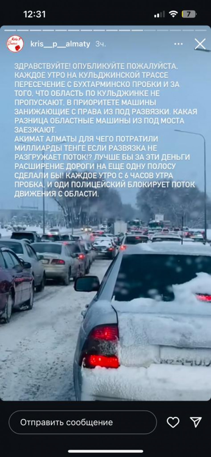 Жители Алматинской области тоже прилично понервничали с утра, пытаясь добраться до работы вовремя. На Кульджинском тракте в сторону Алматы образовались километровые пробки из-за перекрытия дороги. Авторы ролика в социальных сетях пишут, что пробка началась еще в поселке Кызылту.