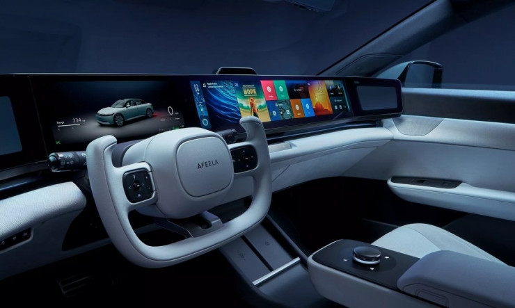 В салоне руль выполнен в виде штурвала, а на всю ширину передней панели растянут дисплей. Отдельные мониторы есть и у задних пассажиров. Afeela 2024 года получил новую центральную консоль и две беспроводные зарядки для смартфонов. В Sony разрабатывают для электрокара автопилот.