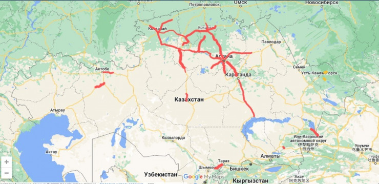 Сообщается, что введено ограничение движения транспорта, которое действует на 31 участке автодорог республиканского значения в восьми областях: