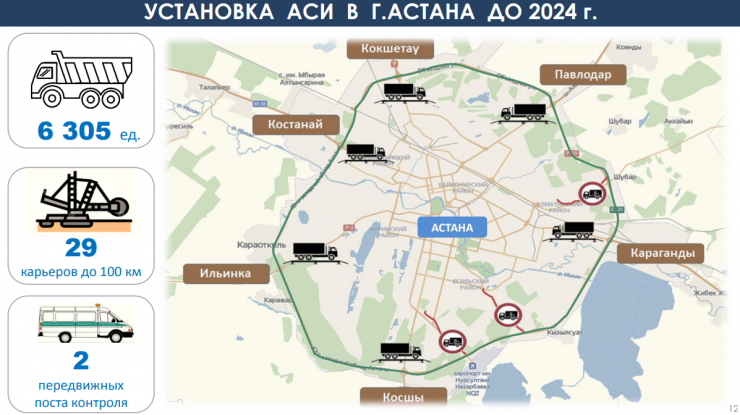 В рамках реализации указанного закона министерства транспорта, внутренних дел и акимат Астаны разработали совместную дорожную карту, в соответствии с которой с октября акимат столицы начал установку АСИ на шести точках заезда автотранспортных средств в город.
