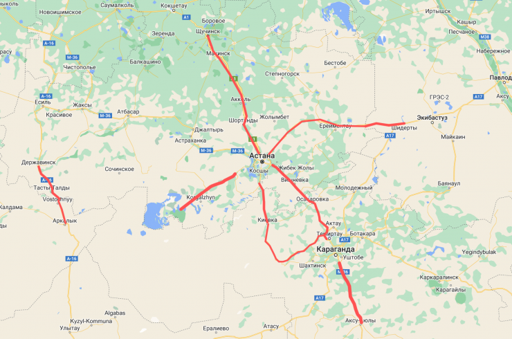- Астана - Петропавловск, километры 18-234, от Астаны до Щучинска;