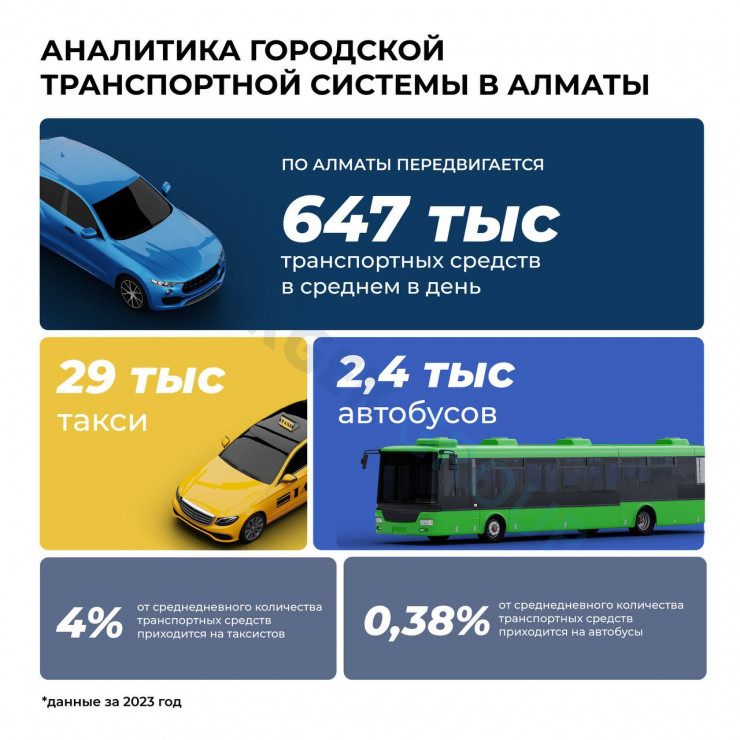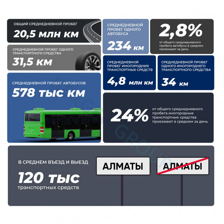 Среднедневной пробег всех транспортных средств в Алматы за 2023 год составил 20,5 миллиона километров.