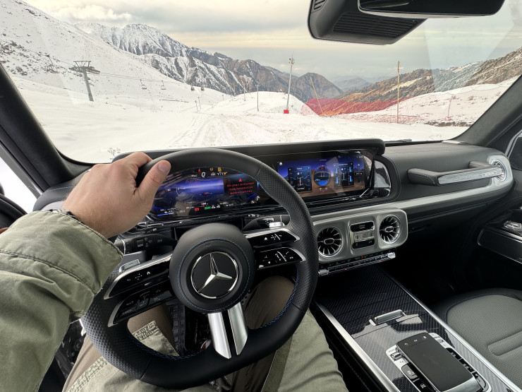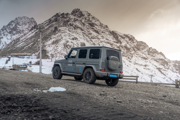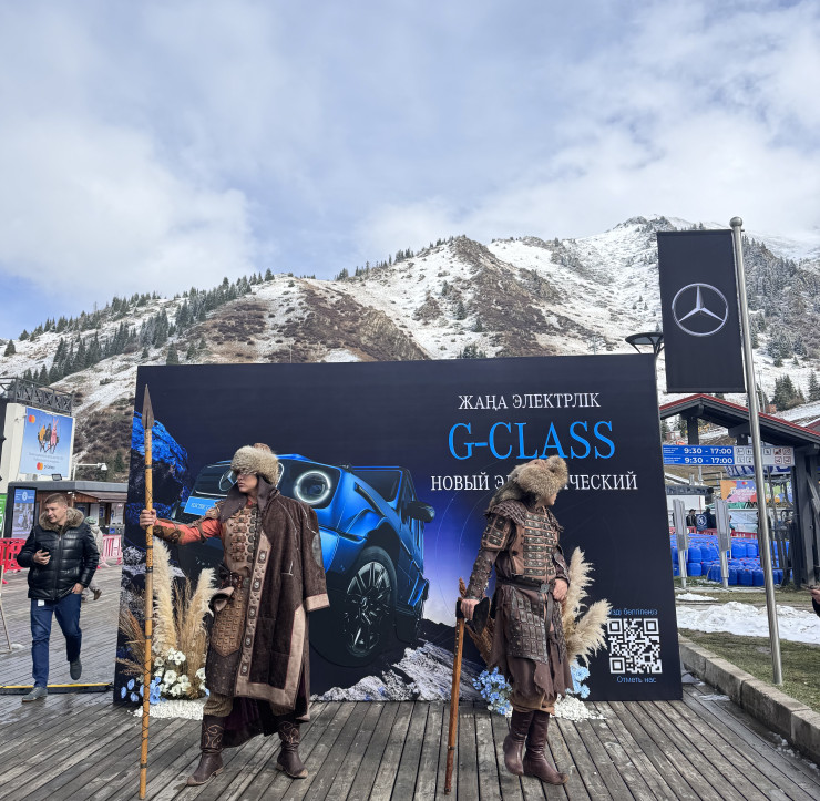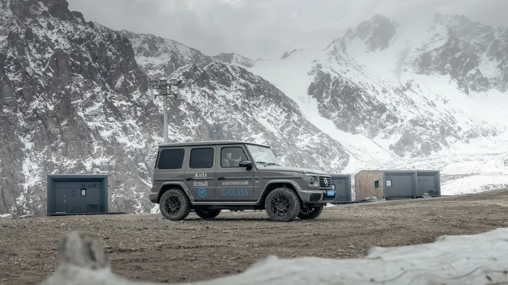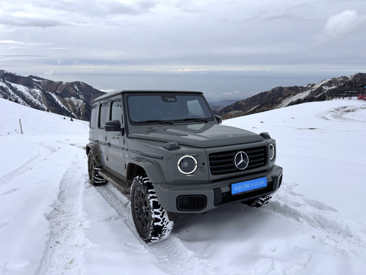 В рамках презентации гости смогли оценить возможности электрического G-Class, поднявшись на вершину Шымбулака, станцию на высоте 3200 метров. Подъем проходил по крутым горнолыжным склонам, где автомобиль уверенно преодолел маршрут.