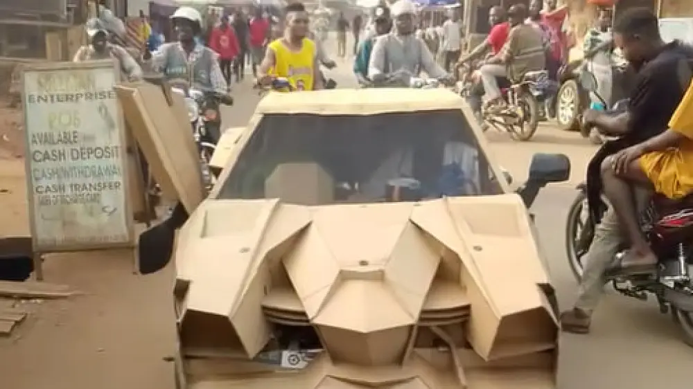 Работа заняла 2 года, и теперь этот картонный шедевр катается по дорогам Нигерии с максимальной скоростью 40 километров в час и собирает взгляды прохожих и миллионы просмотров в сети.