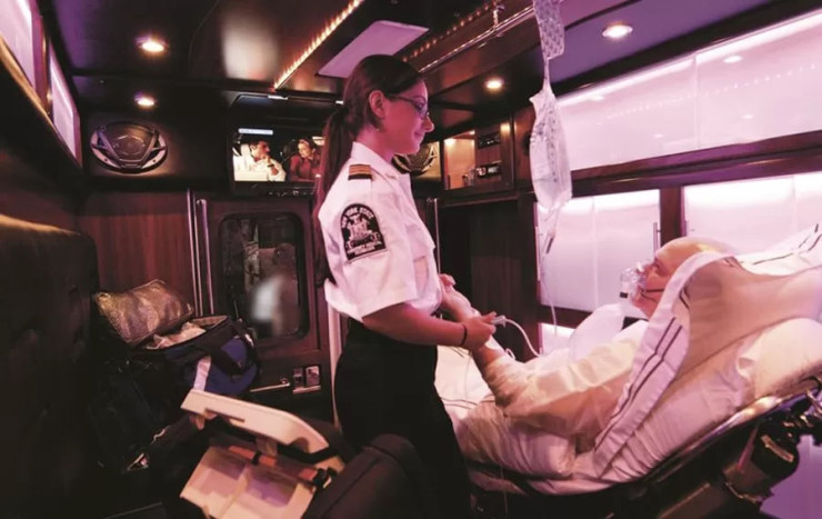Внешне этот автомобиль может показаться обычным, но его внутреннее убранство - совсем другое дело. Возможно, это самая роскошная скорая помощь в мире. Интерьер, выполненный в коже и красном дереве, авто оснащено Wi-Fi, цифровым ТВ, аудиосистемой, баром, массажным креслом и личным врачом. Подобные услуги предоставляет компания Citywide Mobile Response, за которые взимается плата от 350 долларов в час.