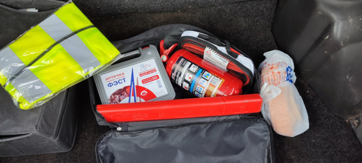 Включает в себя красную треугольную аварийную сигнализацию, буксирный трос, насос для накачивания шин и другие необходимые инструменты.
