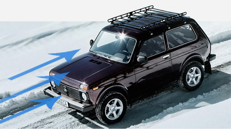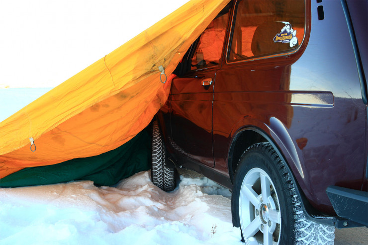 Таким образом вы получите небольшое жизненное пространство рядом с машиной и сделаете дополнительную теплоизоляцию. Как известно, салон теряет тепло через стекла окон. Накрыв их, вы сможете дольше сохранить тепло в машине.