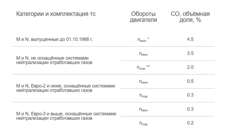 Напомним, согласно Техрегламенту ТС 018/2011 "О безопасности колесных транспортных средств", показания газоанализаторов при проверке бензиновых авто не должны превышать следующие нормы СО: