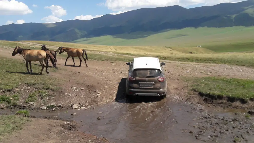 Грунтовая дорога тянется прямо через равнину, вдоль горной реки. По пути встречаются броды, один из них довольно глубокий. По обе стороны, а иногда и прямо на дороге, пасутся большие стада — коровы, лошади, овцы и козы.