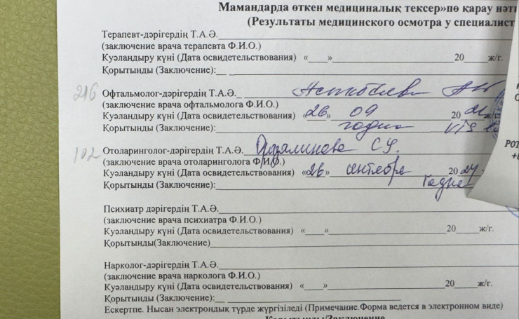 В первую очередь девушка отправилась за медицинской справкой. Как оказалось сделать ее можно только платно, и в перечень ОСМС услуга специалистов (офтальмолог, отоларинголог, психиатр, нарколог) не входит.