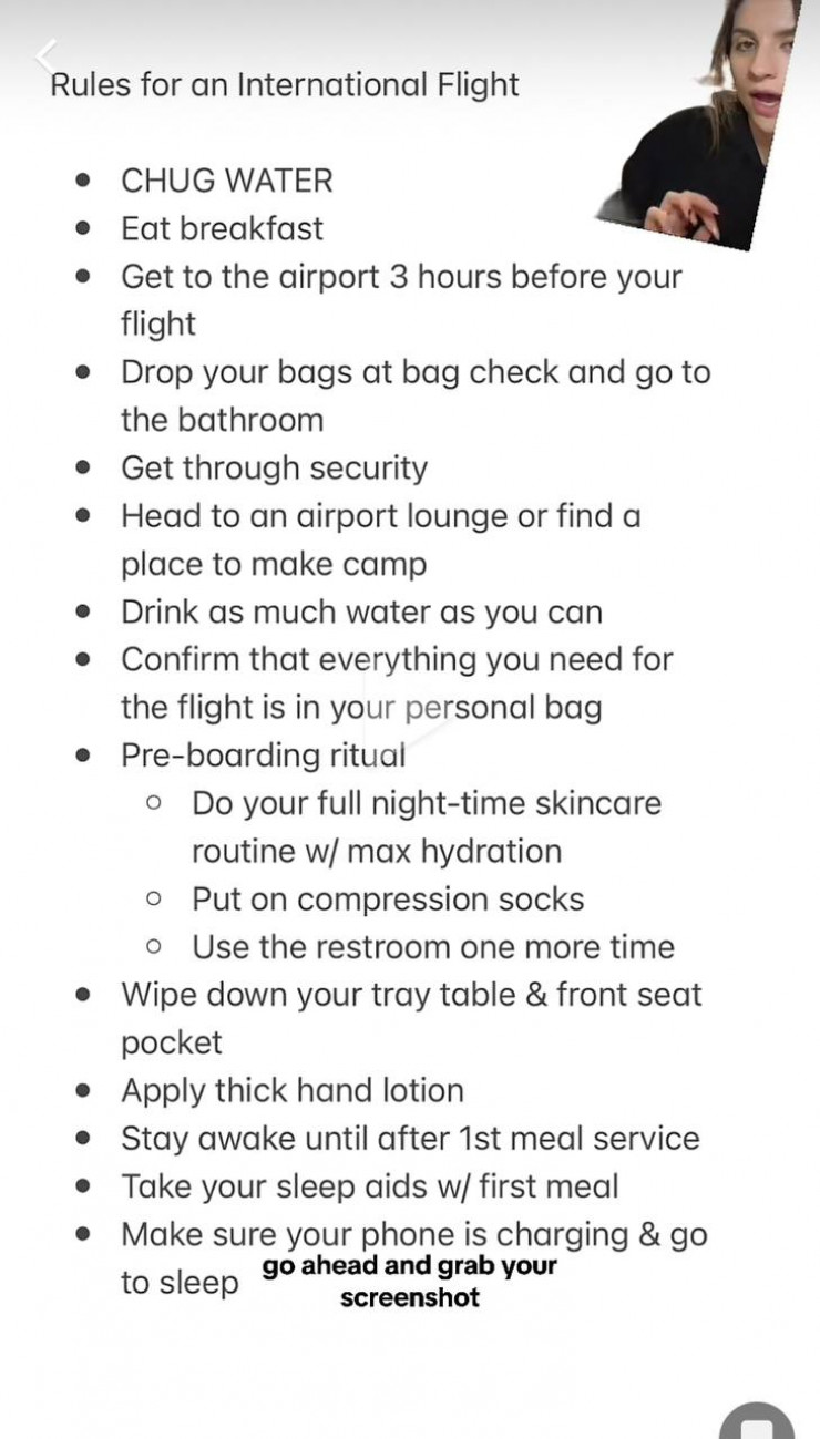 Пользователь TikTok с ником @localbaepsae поделилась своим списком полезных правил для международных путешествий. Виральный ролик девушка записала после 15-часового полета из Атланты, штат Джорджия, в Южную Корею.