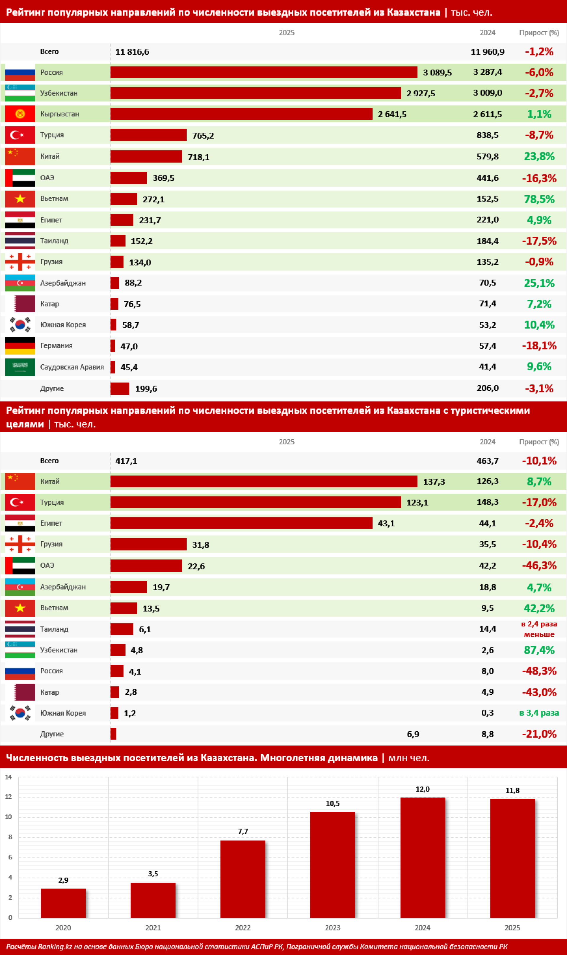 Согласно данным издания, в 2025 году из Казахстана за границу выехали 11,8 миллиона человек, это на 1,2 процента меньше, чем годом ранее. Речь идёт о поездках без цели трудоустройства или переезда на ПМЖ.