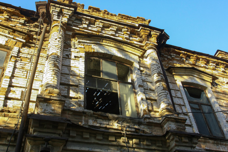 Напротив, на контрасте - практические потерявшие былой лоск образцы купеческой застройки, ныне напоминающие инвалидов в лохмотьях, будто протянувших руку за милостыней.