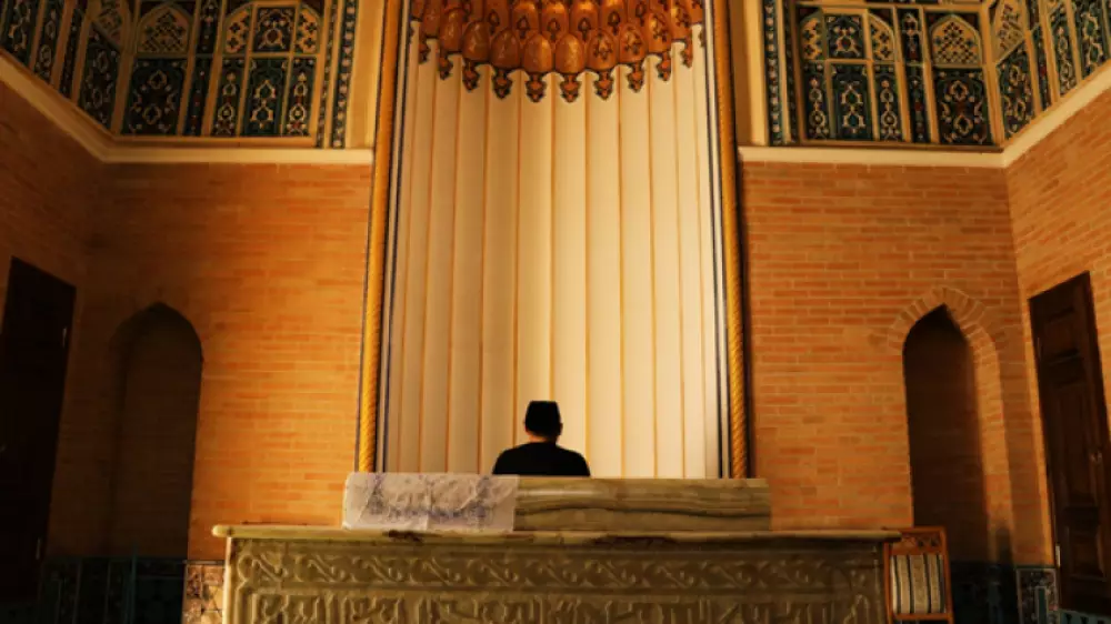 Имам читает молитву в мавзолее Толе би.