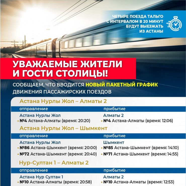 - № 4/3 Астана (Нурлы Жол) – Алматы-2 в 20:20.