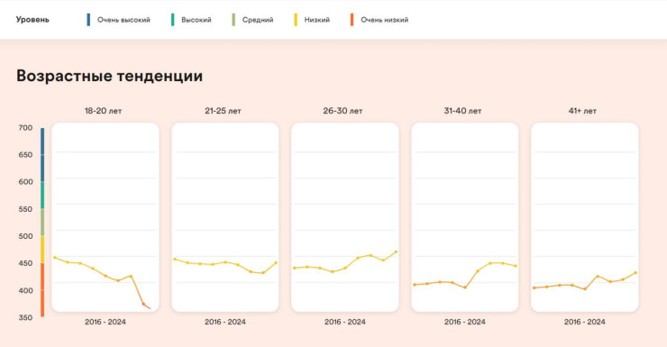 Лучший показатель зафиксирован среди возрастной группы 26–30 лет (индекс 459), а самый низкий – у молодежи 18–20 лет (359).
