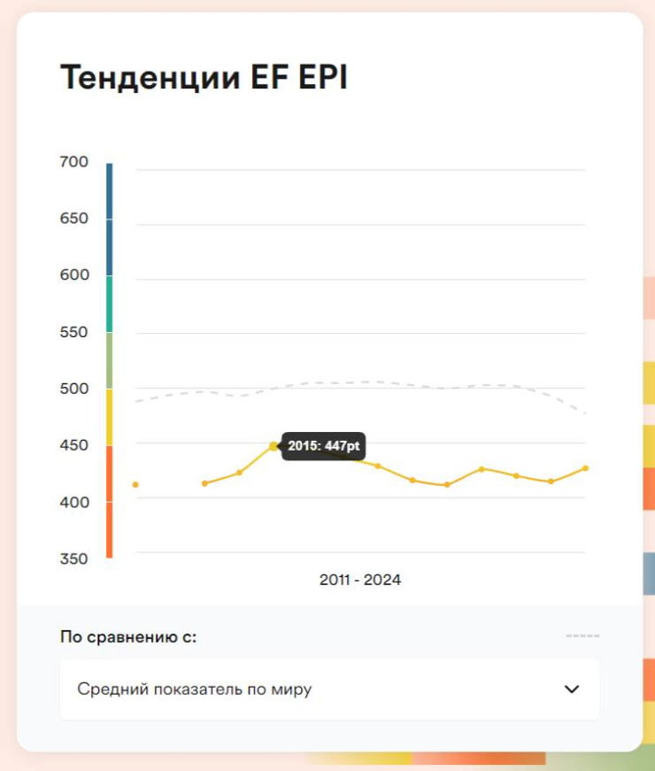 Общий уровень владения английским языком по миру продолжает снижаться: около 60 процентов стран показали результаты хуже, чем в прошлом году. Особенно заметное падение наблюдается в Азии, где снижение связано с ухудшением показателей в Индии и Китае. В то же время регион Ближнего Востока, включая Саудовскую Аравию, показывает стабильное улучшение.