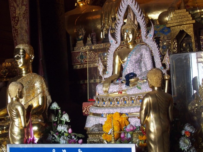 Поднявшись же по лестнице и повернув налево, попадаешь на небольшую внутреннюю площадь, усыпанную песком. Справа перед тобой – с низко нависающими несколькими рядами трехъярусных крыш – Нам Тэйм, открытый главный вихан (так на тайском называют вихару – строение, где проводятся религиозные церемонии для верующих и монахов). Он был построен из тика в 1449 году. За ним устремилась в небо 45-метровая ступа – чеди, как их называют в Таиланде. Под ней, согласно преданию, захоронены реликвии – несколько волосков Будды (отсюда в названии храма есть слова "пхра тхат", обозначающие как раз такие реликвии). Левее – еще один вихан более поздней постройки (1802 год) с очень красивым резным фасадом. Очень важное сооружение находится сразу за чеди: в этом вихане за толстой решеткой обретается, пожалуй, главная святыня Лампанга – небольшая статуя медитирующего Будды из яшмы Пхра Кэо Дон Тао. По легенде, ее изготовили из драгоценного зеленого камня, найденного в арбузе, который принесли в дар монахам ("тао"– арбуз).