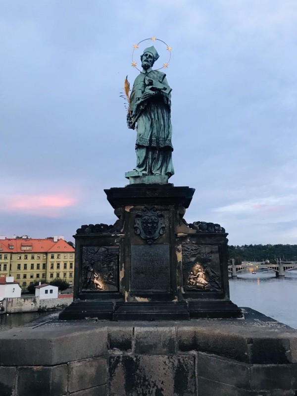 На Карловом мосту находится знаменитая бронзовая фигура покровителя Праги - святого Яна Непомуцкого. По легенде, если потереть небольшой фрагмент с изображением святого на решетке моста, то твое желание обязательно сбудется. Фигурка была натерта до блеска. Не стали нарушать традицию и мы и тоже загадали желания.