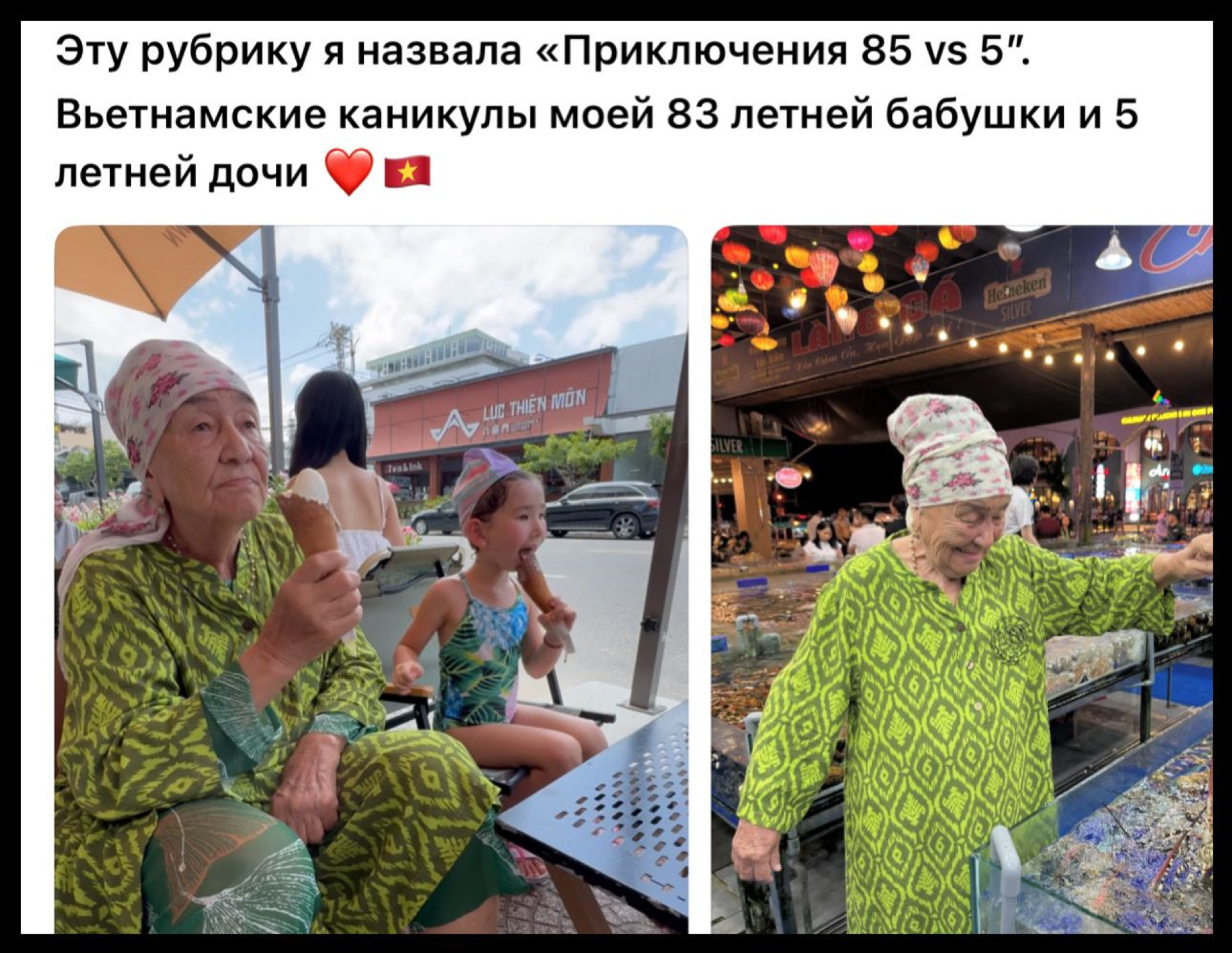 "Эту рубрику я назвала "Приключения 83 vs 5". Вьетнамские каникулы моей 83-летней бабушки и моей 5-летней дочери", - написала Сания.
