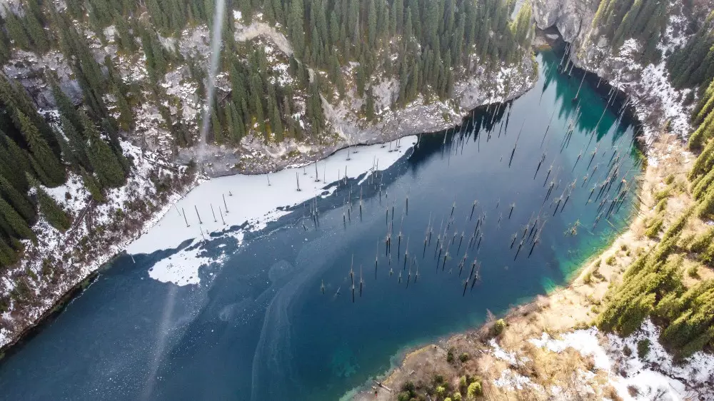 Ученые говорят, что Каинды возникло около 100 лет назад практически случайно - произошел большой обвал горной породы, который перегородил ущелье естественной дамбой. Так получился этот невероятный водоем длиной около 400 метров и глубиной почти 30 метров. Летом, к слову, в озеро можно окунуться - из-за того, что в него втекает горная речка, даже в жарком июле вода в нем ледяная, и такое купание незабываемо. Освежает! Со всех сторон озеро Каинды окружено осыпными каменистыми склонами и крутыми взлетами скал. Выше него - скальный тупик, и только с одной стороны можно подъехать к воде на машине. Со скалистого гребня открываются потрясающие виды на ущелье Саты, долину реки Чилик и само ущелье Каинды.