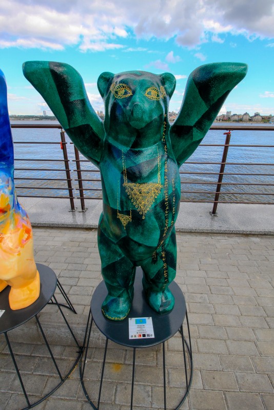Роспись скульптуры каждого медвежонка действительно уникальна, так как характеризует собой национальные особенности родины самого художника. Автором казахстанского медведя является художница, почетный член Академии изобразительных искусств Праги, лауреат Европейского союза искусств Лейла Махат.